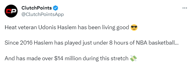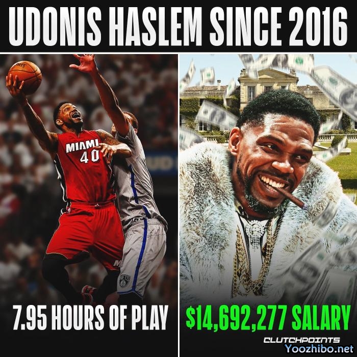 24直播网06月12日美媒晒出热火43岁老将哈斯勒姆​近年来的收入情况,7年出战不到8小时狂赚1400万美元,美媒Clutch Points配文写道:热火老将哈斯勒姆一直活得很滋润,自2016年以来,哈斯勒姆的NBA出场时间不足8小时,期间他挣得了超过1400万美元的薪水。