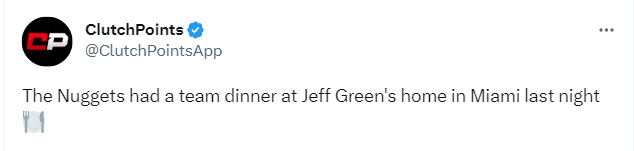 24直播网06月07日掘金热火总决赛G3将在明天正式开打,除了备战之外,据美媒报道,掘金全队在迈阿密进行了一次聚餐,他们在杰夫-格林的家中聚餐,掘金36岁老将宴请全队,今年有望比哈登、威少等前队友率先夺得生涯首冠。