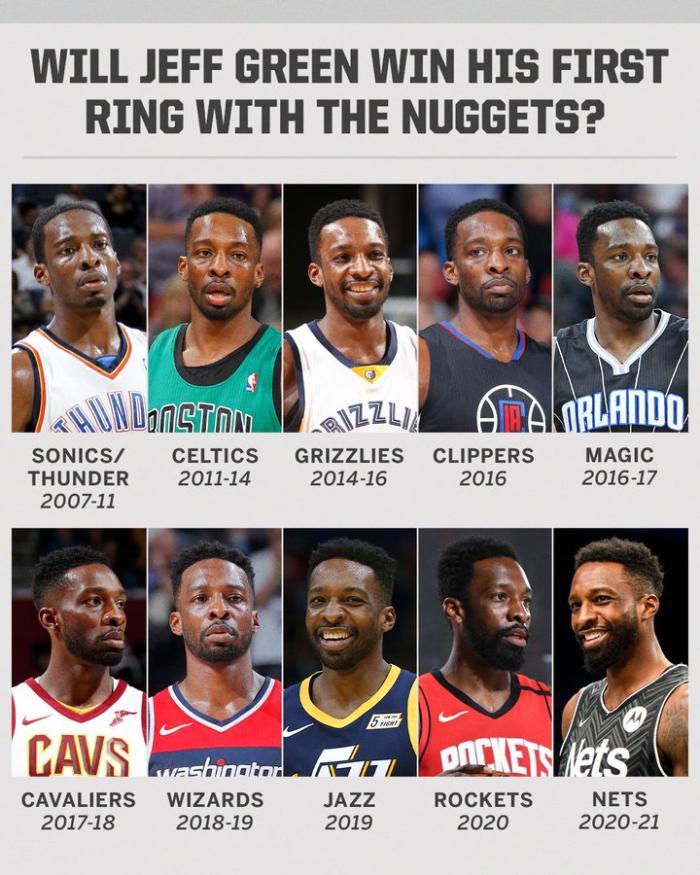 职业生涯至今,36岁格林16年已经换了11支球队,先后为雷霆凯尔特人灰熊快船魔术骑士奇才爵士火箭篮网和掘金效力。