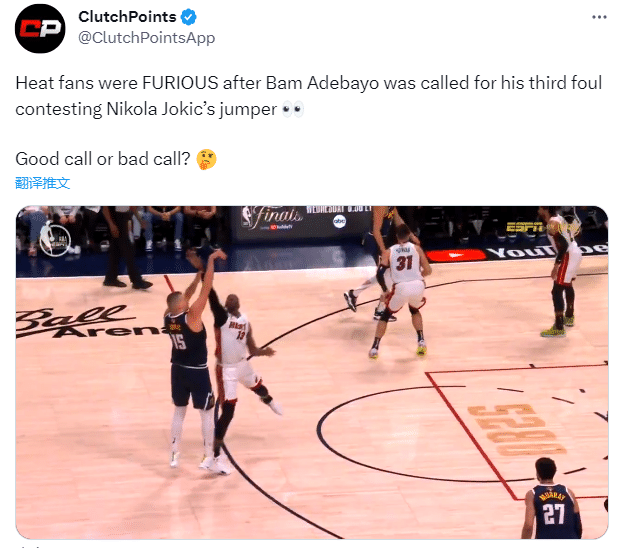 本场比赛也有不利热火的判罚,一是约基奇外线迎着阿德巴约远投三分,裁判吹罚后者打手犯规,当时阿德巴约摊手十分不理解。