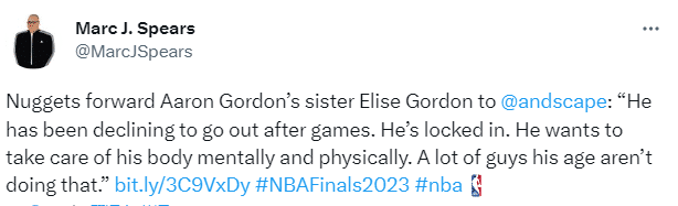 究竟今年季后赛戈登是怎么对待比赛的?掘金球员阿隆-戈登的妹妹艾莉斯-戈登接透露,戈登非常专注,这个赛季他比以往任何时候都更加专注,比赛结束后,他也会拒绝外出,他想在精神上和身体上做好充分准备,很多他这个年纪的人都不会这么做,他考虑着大局。