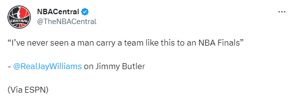 值得一提的是,杰伊-威廉姆斯夸赞巴特勒:我从未见过一个人带领这样的球队进入NBA总决赛;另外名嘴尼克-赖特在节目组表示,若巴特勒今年带队夺冠,他将取代哈登成为NBA近20年TOP10球星之列。