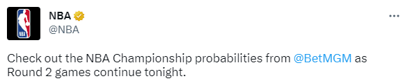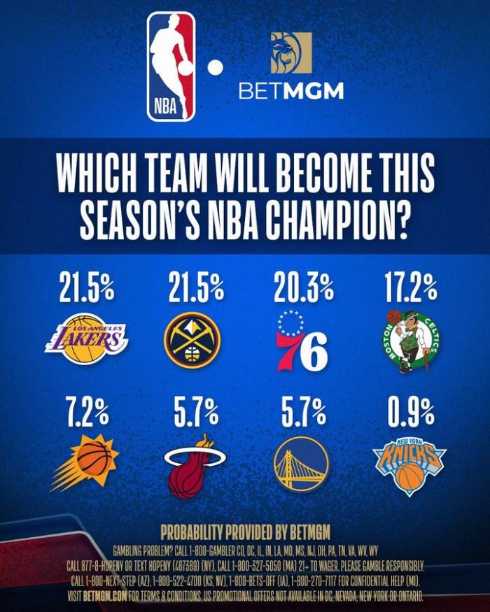NBA官方晒出最新夺冠概率——湖人和掘金21.5%并列联盟第一,76人20.3%排名第三,凯尔特人17.2%排名第四,太阳7.2%排名第五,热火和勇士5.7%并列第六,尼克斯0.9%垫底。