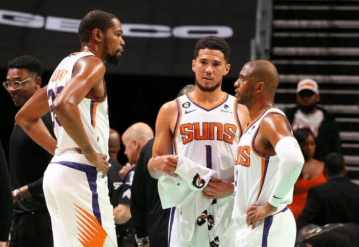 杜兰特和布克领军的太阳、库里和汤普森领军的勇士,都是大比分落后且只要再输一场就会被淘汰出局,因此太阳和勇士夺冠的希望都很小;若太阳止步第二轮,杜兰特抱团组成四巨头将沦为大笑话。