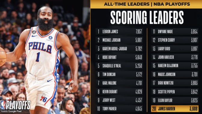 哈登不断的梳理进攻,他也迎来里程碑时刻,抢断反击助攻哈里斯完成扣篮,哈登的职业生涯季后赛助攻数超越以赛亚-托马斯独占历史第14位。