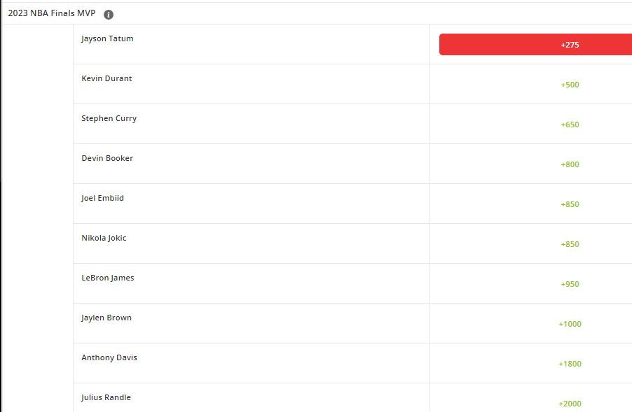 总决赛MVP的最新赔率前十如下:1. 塔图姆(+275)、2.杜兰特(+500)、3.库里(+650)、4.布克(+800)、5.恩比德(+850)、5.约基奇(+850)、7.詹姆斯(+950)、8.杰伦-布朗(+1000)、9.浓眉(+1800)、10.兰德尔(+2000)。