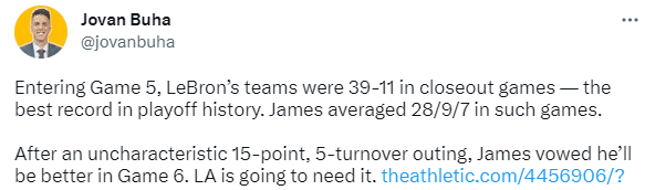 目前詹姆斯在季后赛有机会终结系列赛的比赛中总战绩为39胜12负,而在这样的比赛中,老詹场均至少拿到28分9篮板7助攻。