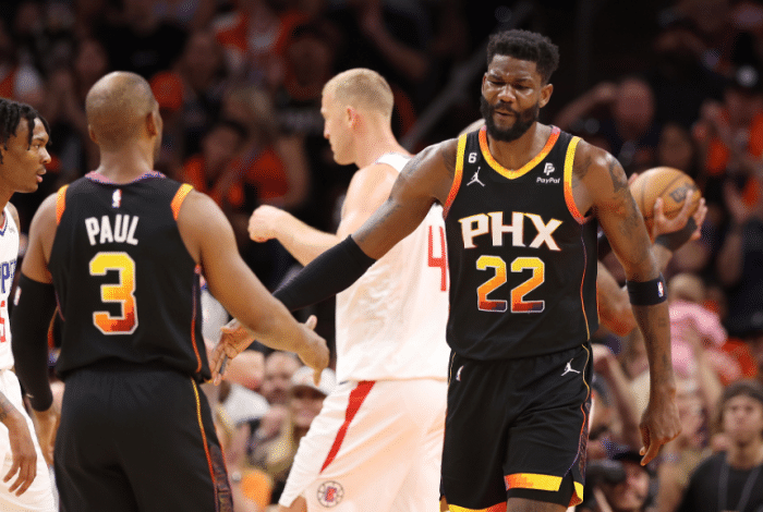 在首轮淘汰快船的系列赛中,布克场均能得到37.2分5篮板6.4助攻2.6抢断,投篮命中率为60%,三分命中率为47%,罚球命中率为86%,进攻端火力十足;而且布克的防守被低估了,他将是限制穆雷的关键,杜兰特可能防守小波特。