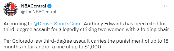 24直播网讯04月27日森林狼首轮1-4被掘金淘汰出局后,狼队新星爱德华兹惹上官司,G5出局后挥舞椅子砸伤多人,因涉嫌用折叠椅殴打两名女性被指控为三级袭击罪,根据科罗拉多州的法律,爱德华兹最高面临18个月的监禁和1000美元的罚款。