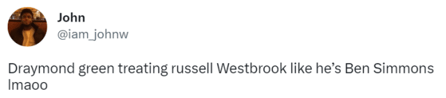 不少球迷都联想到了篮网的西蒙斯。西蒙斯也有不敢出手的问题,就算是对手放自己投,他也更愿意选择传球。在社媒上,多位球迷聊到威少时,都提到了本-西蒙斯,认为威少遭遇到了西蒙斯式的待遇。有球迷写道:“追梦对待威少,就好像他是本-西蒙斯一样,笑死我了。”还有一个署名是小卡球迷的写道:“我宁愿有本-西蒙斯,也不想要威少。”