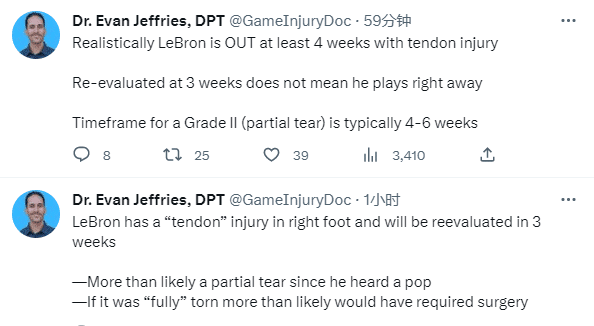 该专家还表示,实际上,勒布朗因肌腱受伤至少缺席 4 周;3周后评估并不意味着他能马上重返赛场,二级撕裂的康复时间通常为4-6周。