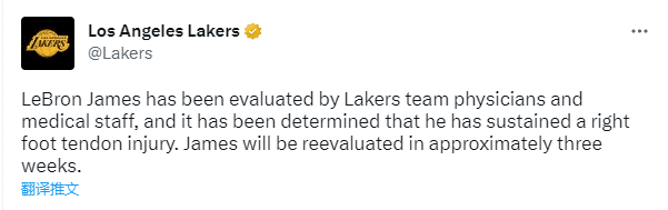 湖人官宣詹皇右脚肌腱拉伤:至少伤停3周无需手术 专家详解复出时间