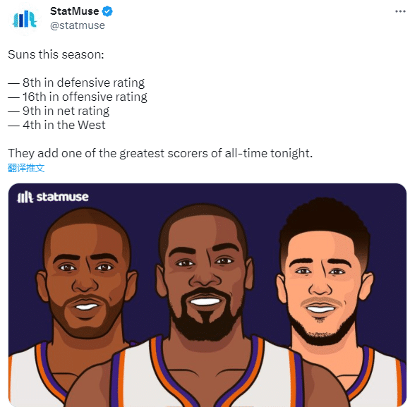美媒Statmuse晒出太阳队关键数据——防守效率排名联盟第8,进攻效率排名联盟第16,百回合净胜分排名联盟第9,目前33胜29负排名西部第4;还写道:他们将在今晚增加一位NBA历史上最伟大的得分手之一。