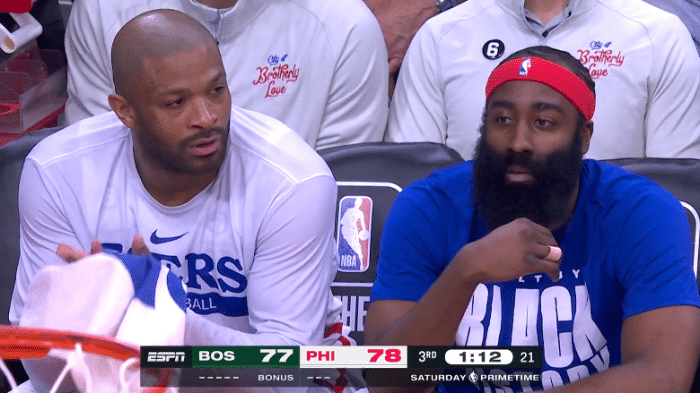 据费城记者Keith Pompey报道,第三节期间,坐在凯尔特人替补席附近的76人球迷和绿军球员发生冲突,总共4位球迷被赶出球馆。