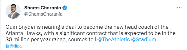 24直播网讯02月25日,据名记Shams报道,前爵士主教练斯奈德接近成为老鹰新主帅,年薪预计约800万美元,预计他将重拾教鞭,执教特雷-杨和穆雷带队冲击季后赛。
