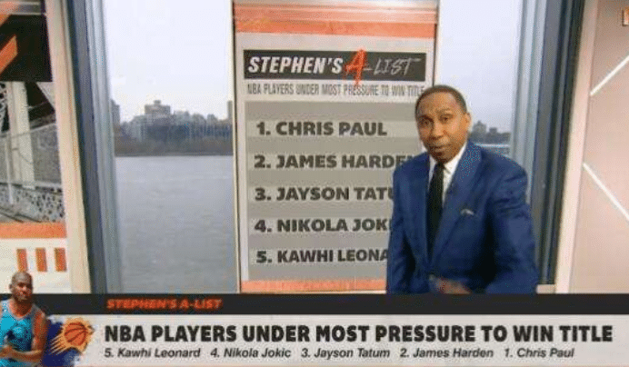 24直播网讯02月24日,NBA现役球员之中谁的夺冠压力最大?美名嘴斯蒂芬-A-史密斯在节目中,列出了他心目中夺冠压力最大的球员,在这份名单的球员有:克里斯-保罗、詹姆斯-哈登、杰森-塔特姆、尼古拉-约基奇和科怀-莱昂纳德。
