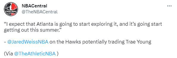 24直播网讯02月24日,据NBA记者Jared Weiss报道,预计老鹰将在探索交易特雷-杨,并且将在今夏开始兜售他;目前老鹰正在积极签约新的主教练,正专注于聘请斯奈德担任球队新帅。