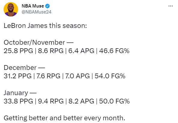 美媒NBA Muse统计了本赛季詹姆斯的每个月的场均得分,具体情况——10月份/11月份,詹姆斯场均25.8分8.6篮板6.4助攻,投篮命中率46.6%;在12月份,詹姆斯场均31.2分7.6篮板7助攻,投篮命中率54%;1月份詹姆斯场均33.8分9.4篮板8.2助攻,投篮命中率50%,这是老詹生涯单月场均第二高得分。