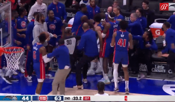 第二节还剩30多秒,海耶斯救球时被大莫瓦格纳阴招推倒,迪亚洛冲过来从背后推搡大瓦格纳,海耶斯站起来后,一记重拳打到瓦格纳的后脑勺,冲突发生在活塞替补席,活塞球员蜂拥而至险些引发围殴,现场十分混乱,班凯罗等魔术球员也冲过来拉架,之后他们被拉开,瓦格纳捂着后脑勺十分痛苦。