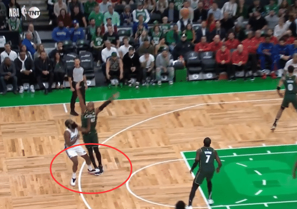 NBA揭幕战正式开打,76人开场被绿军打出9-3的攻势,第一节8分24秒,哈登外线强投撤步三分,落地时踩在霍福德的脚上,哈登失衡倒地,裁判吹罚犯规,之后裁判跑到技术台商量,最终吹罚霍福德垫脚,一级恶意犯规;霍福德早早2犯被迫下场。