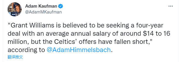 来源:24直播网10-14 20:5224直播网10月14日,据凯尔特人记者Adam Kaufaman报道,格兰特-威廉姆斯想要一份最高4年6400万美元的续约合同,但凯尔特人给的报价低于格威的预期;双方都有意达成4年合同,但续约金额暂未谈拢,而且谈判陷入僵局。