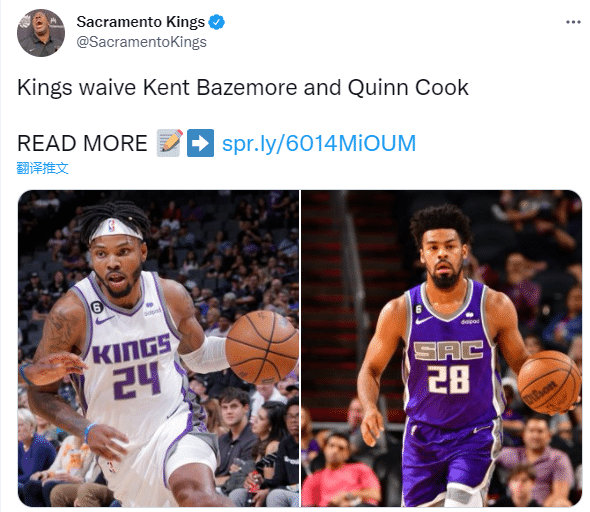 国王官方宣布裁掉球员贝兹莫尔和奎因-库克,此前他们都和国王签下一年无保障底薪合同,2021-22赛季,贝兹莫尔拒绝勇士大合同,为湖人出战39场,场均拿到3.4分1.8篮板。
