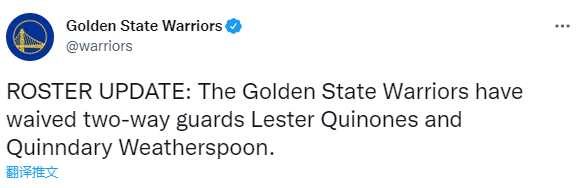 勇士官方宣布正式裁掉双向合同球员基诺内斯和威瑟斯庞;据勇士记者报道,四名临时工斯潘塞、安东尼-兰姆、杰罗姆-罗宾逊和泰-杰罗姆将争夺2个双向合同名额。