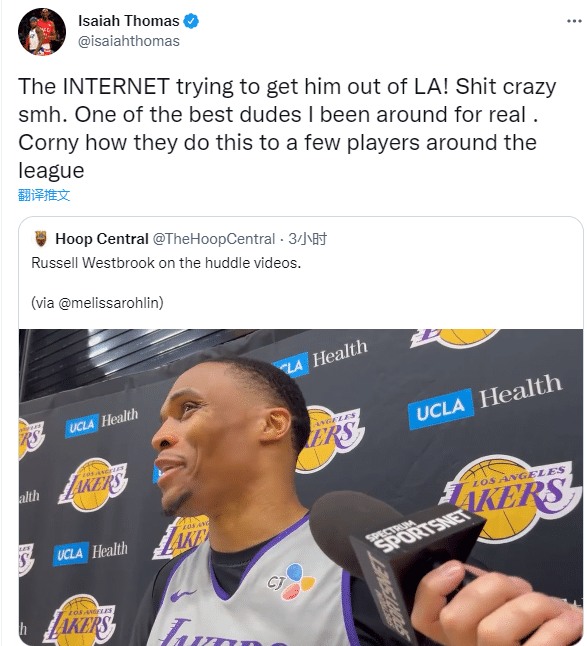 湖人旧将小托马斯转发威少采访报道,并且配文写道:因特网想把威少赶出洛杉矶!真特么疯了,他是我认识的最好的人之一,他们对联盟里的少数几个球员这么做真是土得掉渣。