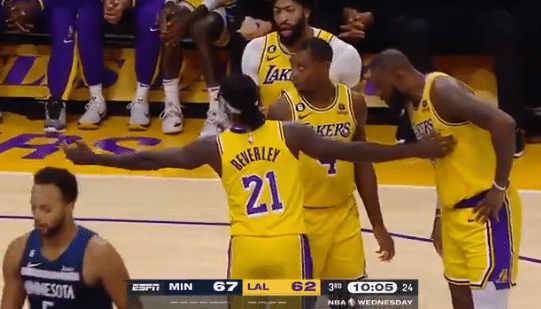 湖人主场对阵森林狼赛前,当湖人众球员围在一起加油时,威少站在远处,这一幕威少被质疑远离团队不合群;从另一角度可以看出,其实,赛前入场时,威少先后与浓眉、詹姆斯等队友击掌,更是和老詹一起做出秀肌肉的姿势;之后威少跑到替补席,脱掉球衣外面的T恤然后上场,和教练进行了一番交流。