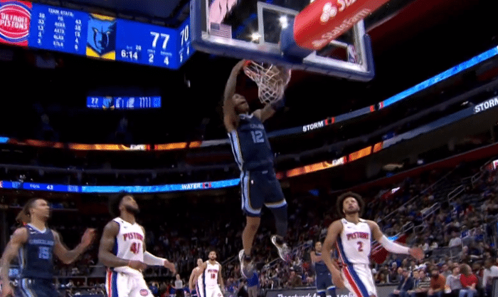 下半场,莫兰特第三节更是尽显不可思议的天赋,莫兰特抢断后持球一条龙反击,背运晃过对手,然后杀到禁区双手折叠砸扣;莫兰特一挑四高难度投篮,反击中接队友传球,直接滑翔暴扣虐筐,直播解说调侃活塞篮筐太遭殃了;第三节莫兰特早早打卡下班,单节独砍17分打疯了,多次暴扣太疯狂。