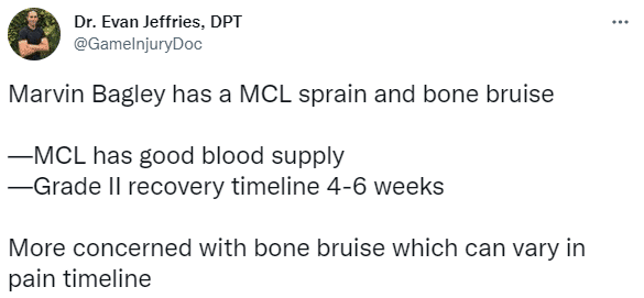 医学专家Evan Jeffries发推写道:巴格利遭遇右膝骨挫伤和右膝副韧带扭伤,血液供应良好,二级扭伤的恢复期是4-6周,更关注的是骨挫伤,因疼痛可能需要更长的时间康复。