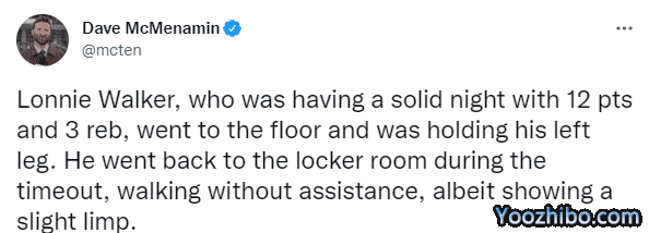 第三节5分31秒,贝弗利在防守时和安德森相撞,贝弗利倒地时压到了朗尼-沃克的腿,沃克的膝盖扭了一下,之后沃克坐在地板上捂着膝盖,威少站在沃克身旁十分担忧沃克的伤情,湖人队医第一时间过来检查沃克的膝盖,随后沃克有些一瘸一拐,离场返回更衣室。