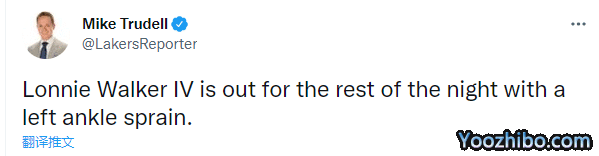 随后湖人方面宣布,朗尼-沃克左脚踝扭伤,本场比赛不会回归;沃克脚踝扭伤,此前沃克因脚踝伤病曾缺席季前赛,湖人巨星浓眉因背部紧张也缺席了几场季前赛。