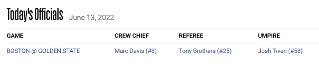 57岁的托尼-布拉泽斯(很多球迷叫他“托尼兄弟”)执哨勇士20场季后赛,勇士12胜8负,执哨22场凯尔特人季后赛,凯尔特人7胜15负。托尼-布拉泽斯此前执哨了今年的总决赛G2, 勇士107-88大胜凯尔特人。
