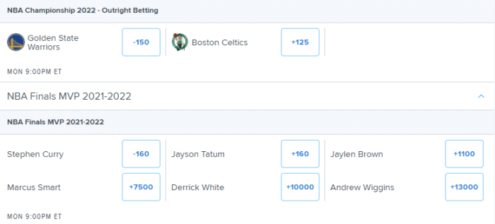 最新FMVP赔率,库里-160排名第一,塔图姆+160、杰伦-布朗+1100、斯玛特+7500、怀特+10000、维金斯+13000。