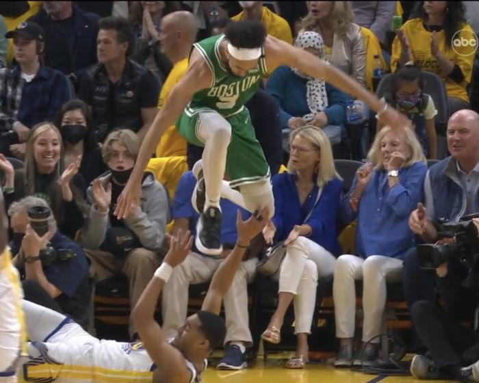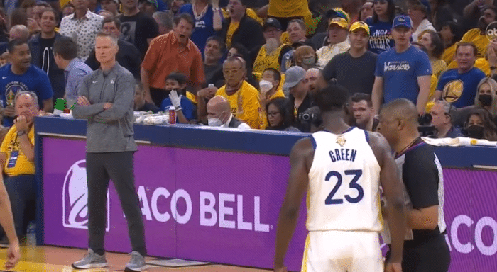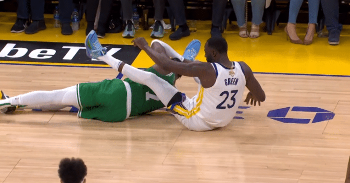 上半场快结束时,格林外线对杰伦-布朗犯规,格林倒地时把脚放在布朗的脑袋上并且从背后推了一把布朗,两人发生冲突吵起来,对此裁判仅仅吹罚普通犯规,没有技犯也没有恶犯,格林逃过一劫。