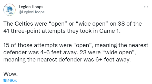 据统计,总决赛G1凯尔特人全队投了41记三分,其中有38次处于空位(open)或者完全空位(wide open),15次空位意味着最近的防守人站在4-6英尺的地方,23次完全空位意味着最近的防守人站在6英尺(将近2米)以外的地方。