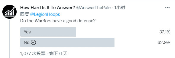 有人发起勇士是否有好的防守的投票,1000多人参加投票,有62.9%的人认为勇士防守太差,37.1%的人力挺勇士。