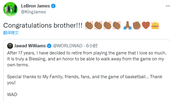 来源:24直播网06-01 10:4624直播网06月01日讯 ,勒布朗-詹姆斯前队友贾瓦德-威廉姆斯在社交媒体上宣布正式退役,老詹本人发推祝贺:恭喜我的兄弟(4个鼓掌+拳头+爱心+王冠表情)。