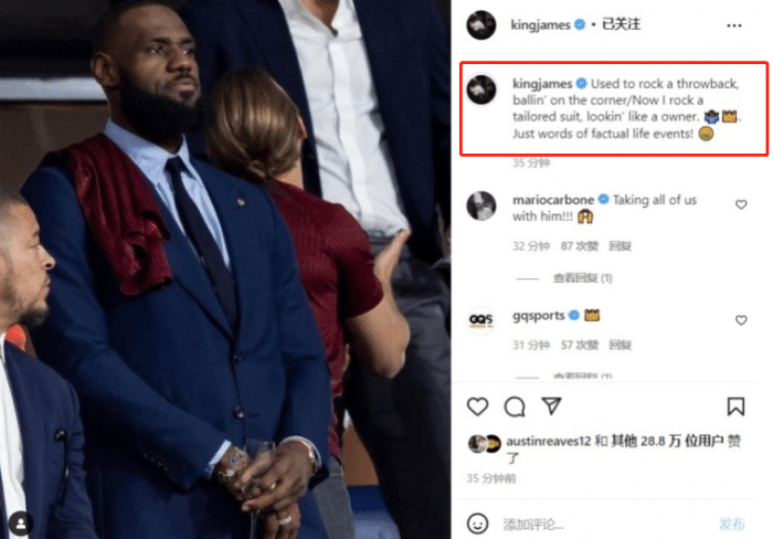 詹姆斯在看台上很失望,表情也不是很高兴。而在利物浦丢冠后,詹姆斯也更新社媒,他晒出了自己身穿西服在现场看比赛的照片,并且配文。“以前我穿着复古球衣,在街头打球,现在我穿着定制西装,看起来像一个老板,我只是在描述真实生活发生的事情”。詹姆斯除了是利物浦队的老板之外,他未来还很可能拥有一支NBA球队,就像乔丹一样,这也是老詹在退役之后的目标,预计詹姆斯还会再打2个赛季。