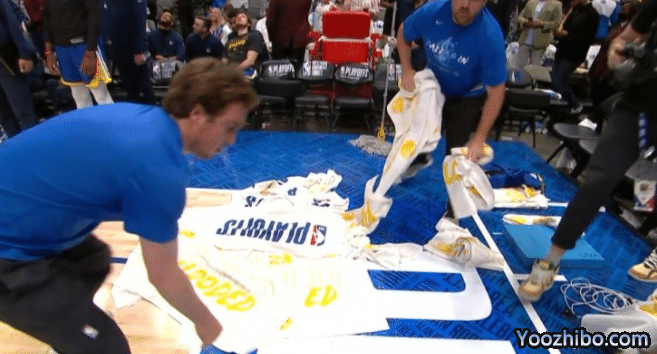 因为漏水的情况比较严重,所以独行侠的鲍威尔、克莱伯和约什-格林三个人已经拿着用篮球在踢球。准备下半场的两队球员也重新穿上了训练服,其中东契奇和库里在一起抬着头看漏水,确实很有趣。