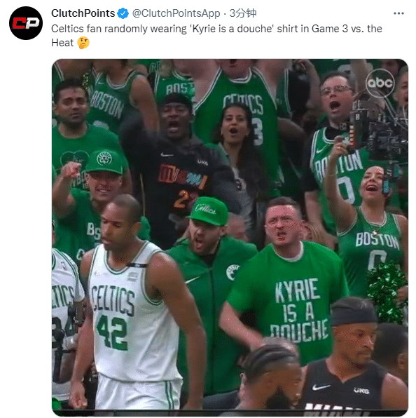 东决G3上半场,凯尔特人一度落后热火26分,绿军主场球迷沮丧地狂嘘主队;塔图姆第二节终于得分并且带队追分,半场打完绿军47-62落后15分;值得一提的是,现场有球迷身穿印有“欧文是一个混蛋”字样的T恤,欧文躺枪。