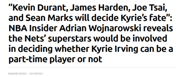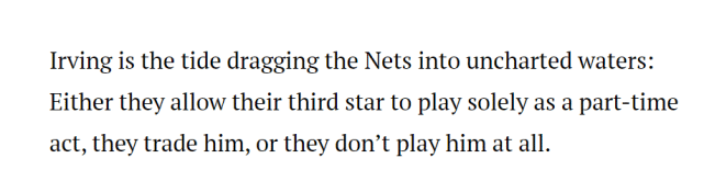 篮网跟队记者Kristian Winfield撰文报道了最新进展,他在文中写了这么一句话,透露了篮网面临的三种选择。“欧文是把篮网拖入未知水域的潮汐:“要么他们允许第三球星以兼职身份出战,要么交易他,或者他们干脆完全弃用他。”