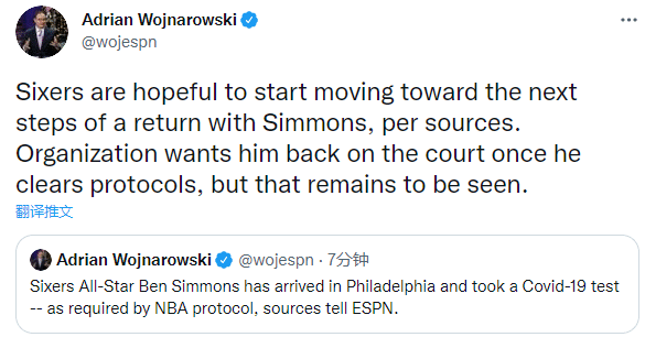 24直播网讯 北京时间10月12日,据ESPN名记沃纳罗斯基报道,76人全明星球员本-西蒙斯已经抵达费城,并且按照规定接受新冠病毒的检测,检测通过之后,76人希望他归队并且为球队出战;此前76人和里奇-保罗谈判关于西蒙斯归队的问题,如今他们双方已谈妥,西蒙斯终于回来了。