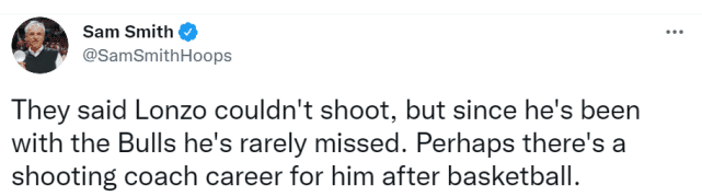 报道公牛多年的专家萨姆-史密斯在社媒上写道:“他们说朗佐不能投篮,但自从他来到公牛,他很少投丢过。也许在退役后,还有投篮教练的生涯在等待他。”