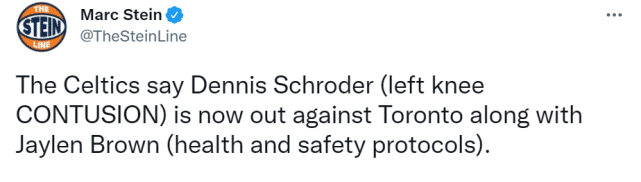 来源:24直播网10-10 11:2724直播网10月10日讯 ,NBA季前赛继续进行,凯尔特人主场迎战猛龙。赛前,名记马克-斯坦恩报道,绿军后卫丹尼斯-施罗德因左膝挫伤,缺席本场比赛,而因新冠检测阳性的杰伦-布朗目前仍在隔离中。绿军官方也更新了布朗的状况:主帅尤杜卡表示,布朗很可能无缘余下的季前赛,但他希望布朗能赶得上常规赛揭幕战。