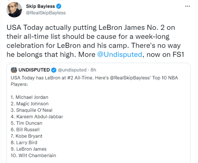 来源:24直播网10-09 16:5224直播网10月09日讯 ,NBA知名评论员斯基普-贝勒斯在节目上谈论《今日美国》的75大巨星排名。《今日美国》将詹姆斯排在历史第二,仅次于乔丹,而贝勒斯公布了自己心中的前十排名,詹姆斯竟然只被他放在第九。