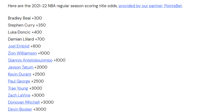 来源:24直播网09-08 19:2824直播网9月08日讯新赛季关于总冠军的归属,关于常规赛MVP的归属,都是人们讨论和关注的话题。当然得分王也是大家所为之关注的焦点,那么最新一个赛季,哪名球员最被看好成为得分王呢?新赛季得分王赔率最新出炉,排名第一的是来自奇才的比尔,力压NBA众多球员排在这一榜单第一名,赔率为+300。