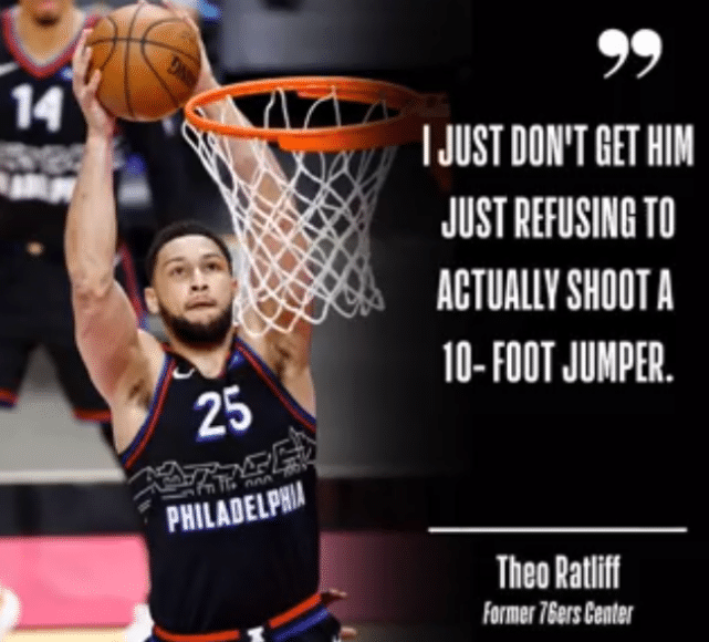 “西蒙斯是全明星球员,是MVP候选人级别的球星,他要做的就是练出10英尺外的跳投。”拉特利夫说道,“就算我当年打球的时候,我们队里有埃里克-斯诺,他不以投射出名,但是他一直在练投篮,练到能在关键时刻出手都进过球。投篮需要训练,我就是不理解,西蒙斯就是拒绝10英尺外的跳投。”