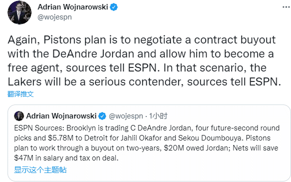 小乔丹和活塞达成买断!放弃400万将成自由球员,将签约湖人助詹皇冲冠